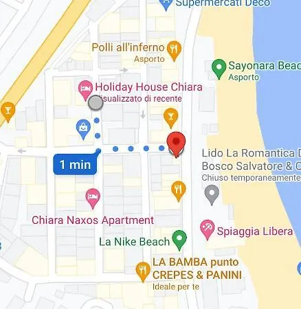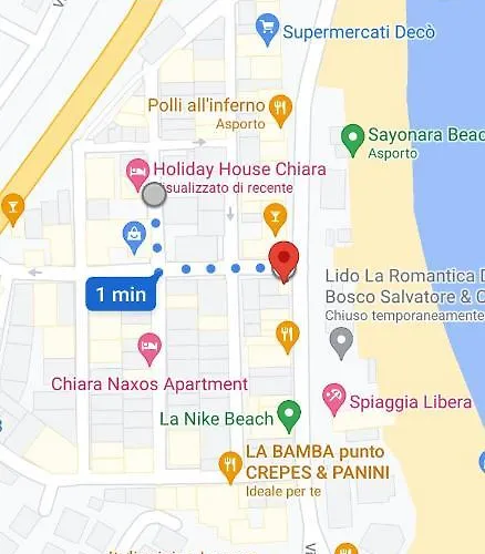 Centrum města Giardini Naxos je 1 km od vily. Je to 3.5 km od dominanty Řecký amfiteátr. Hosté mohou povečeřet v restauraci třeba restaurace s mořskými plody Spizzicannu Ristorante Pizzeria, vzdálené asi 100 metrů. Spiaggia Libera je odsud kousek.
